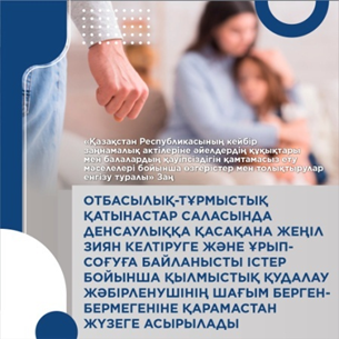 2023 жылы Мемлекет басшысы отбасылық-тұрмыстық зорлық-зомбылықтың кез келген көрінісі үшін жазаны қатаңдатуды тапсырды. Бұл тапсырма Президенттің Жарлығымен 2023 жылғы 8 желтоқсанда бекітілген Адам құқықтары мен заңның үстемдігі саласындағы іс-қимыл жоспарына енгізілді. Оны іске асыру шеңберінде мүдделі мемлекеттік органдар Бала құқықтары жөніндегі уәкілмен және Парламент Мәжілісінің депутаттарымен бірлесіп әйелдер мен балаларға қатысты зорлық-зомбылықтың кез келген көріністері үшін жауапкершілікті қатаңдатуға, отбасы институтын нығайтуға және кәмелетке толмағандардың қауіпсіздігін қамтамасыз етуге бағытталған заңнамалық түзетулер әзірледі.