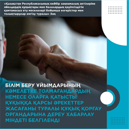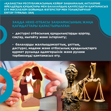 «Қазақстан Республикасының кейбір заңнамалық актілеріне әйелдердің құқықтары мен балалардың қауіпсіздігін қамтамасыз ету мәселелері бойынша өзгерістер мен толықтырулар енгізу туралы» Заң біздің қоғамды демократияландыру бағытындағы тағы бір қадам болып табылады.