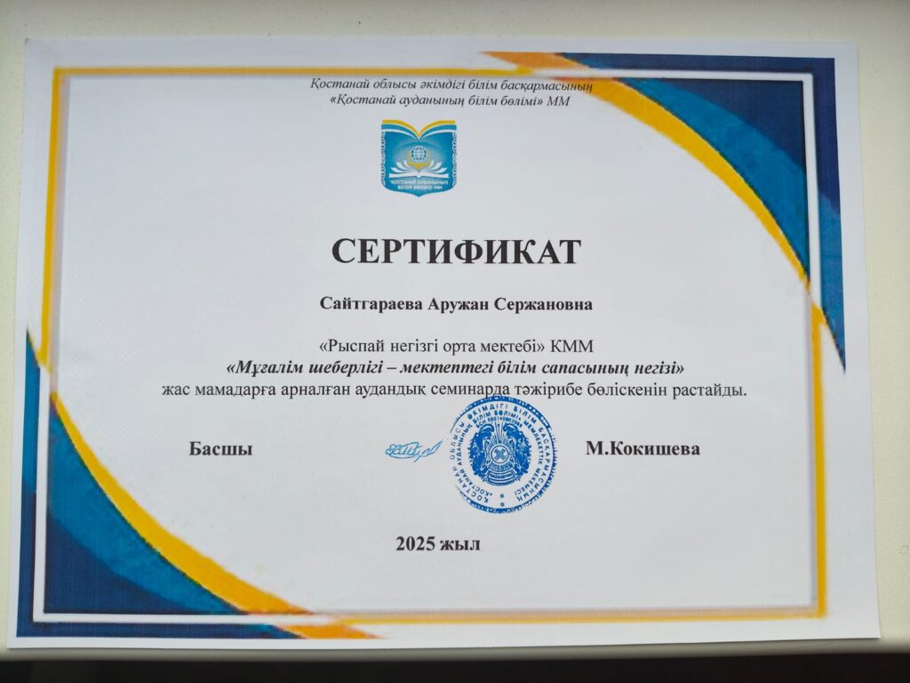 18 декабря 2025 года на базе КГУ «Надеждинская общеобразовательная школа» состоялся районный семинар «Мастерство учителя — основа качества образования школы». В рамках семинара Сайтгараева Аружан Сержановна провела открытый урок и по итогам мероприятия получила сертификат.